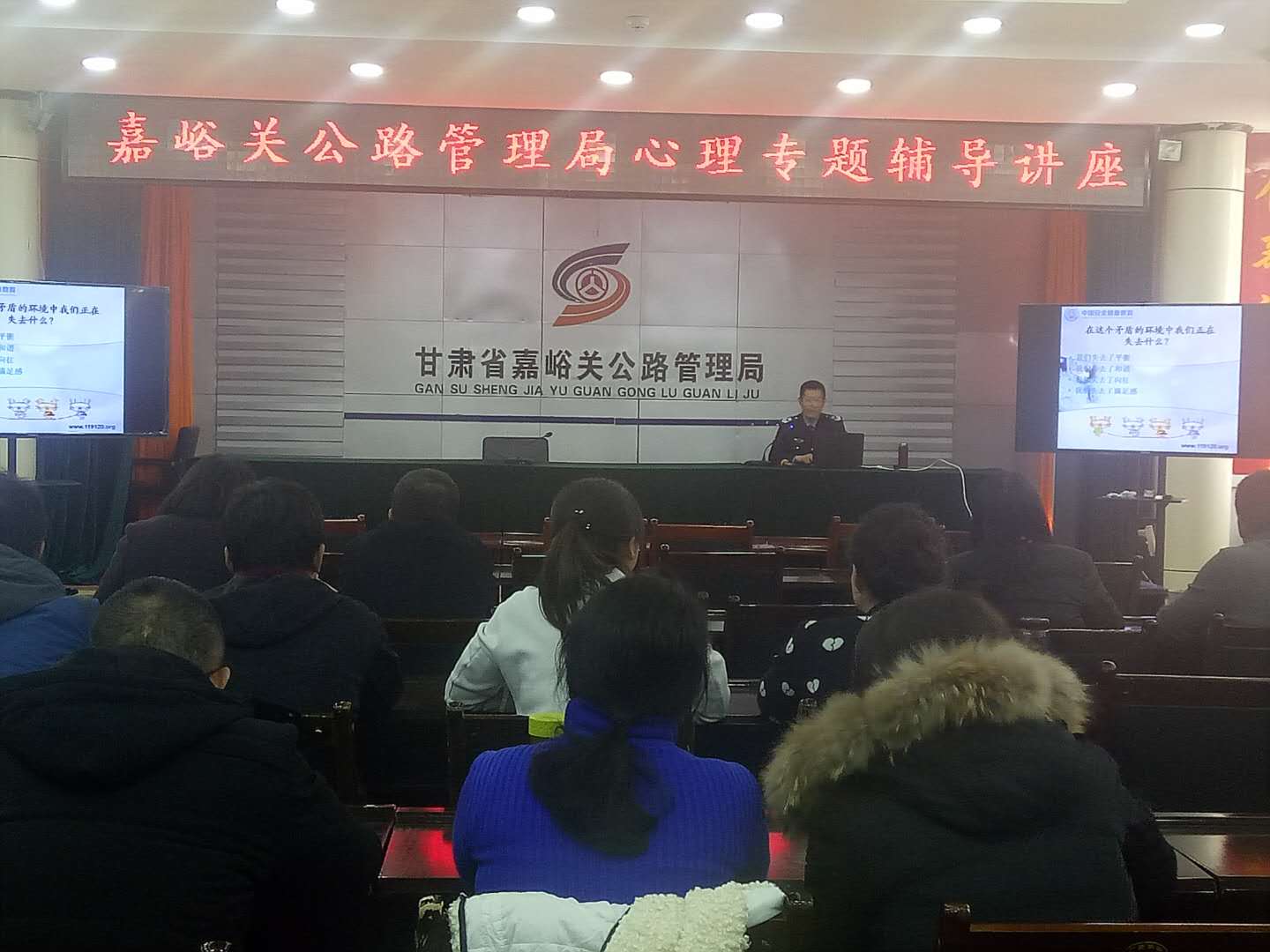 针对当前职工存在的身心健康状况整体下滑、职业倦怠日益明显的状况,12月22日下午,嘉峪关公路管理局利用冬训,邀请专家给两级管理人员送来了缓解情绪的“心灵鸡汤”。讲座中分析了生活压力、工作压力的种种不良表现,并从饮食、运动、心情处理、认知限制等方面讲解了如何有效管理生活工作中的情绪和缓解压力的方法。整场讲座事例鲜活,语言生动,具有很强的指导性、启发性。